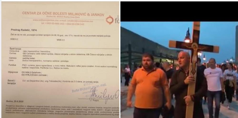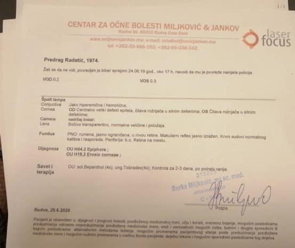Prema nalazu oftamologa, Radetić ima svega 20 posto vida i ima nesnosne bolove u bubrezima, što je, kako kaže Medojević, posledica krvničkih udaraca na zemlji od strane dvojice batinaša, prenosi In4s.