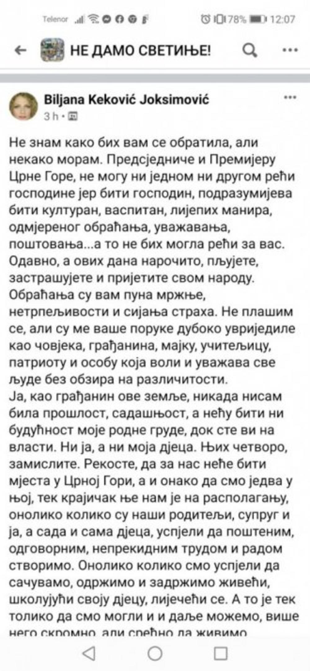 Srpkinja iz Crne Gore Biljana Keković Joksimović dan pred izbore poslala je poruku Milu Đukanovicu i Dušku Markoviću. Njen status prenosimo u celosti: