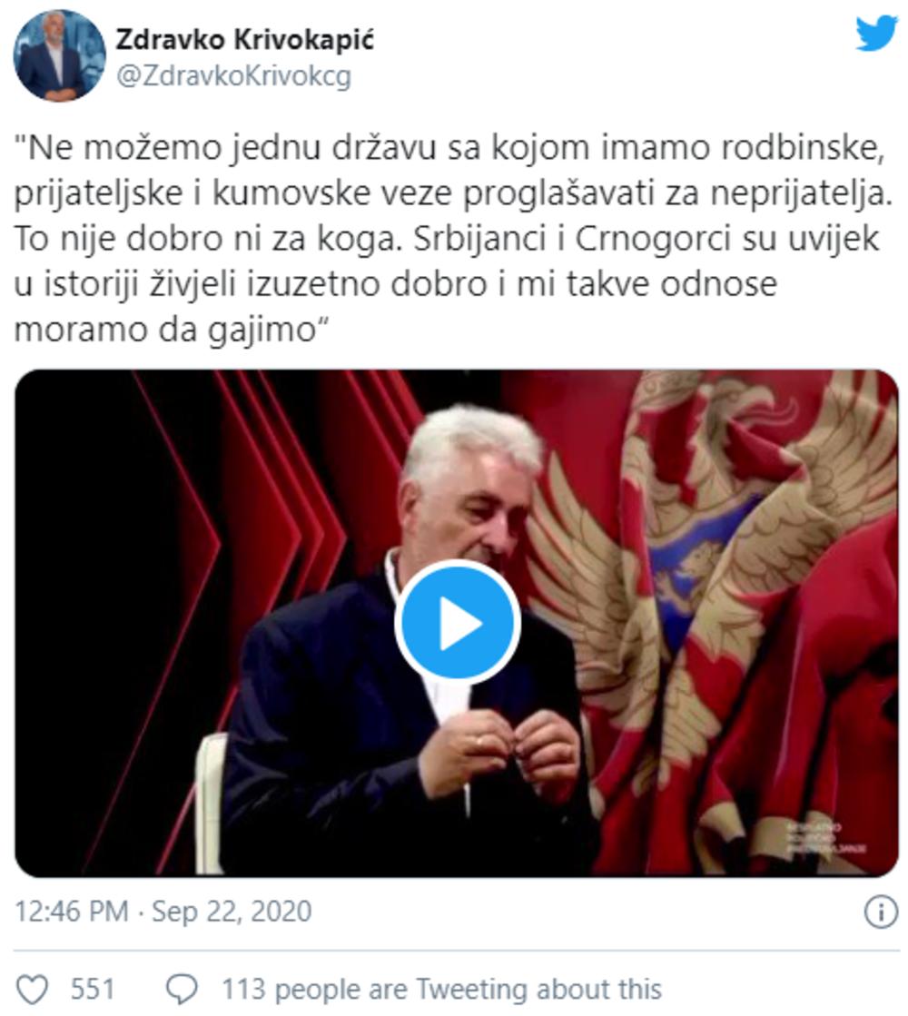 U video objavi na svom zvaničnom tviter nalogu, Krivokapić je istakao da su Srbi i Crnogorci uvek u istoriji živeli izuzetno dobro.