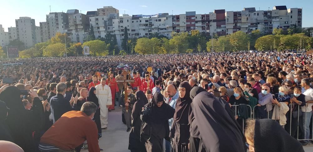 Hiljade i hiljade ljudi iz Podgorice i čitave Crne Gore, mnogi od njih u znak poštovanja, došli su do centra i peške, dočekali pre par minuta u Sabornom hramu povorku sa posmrtnim ostacima mitropolita Amfilohija.