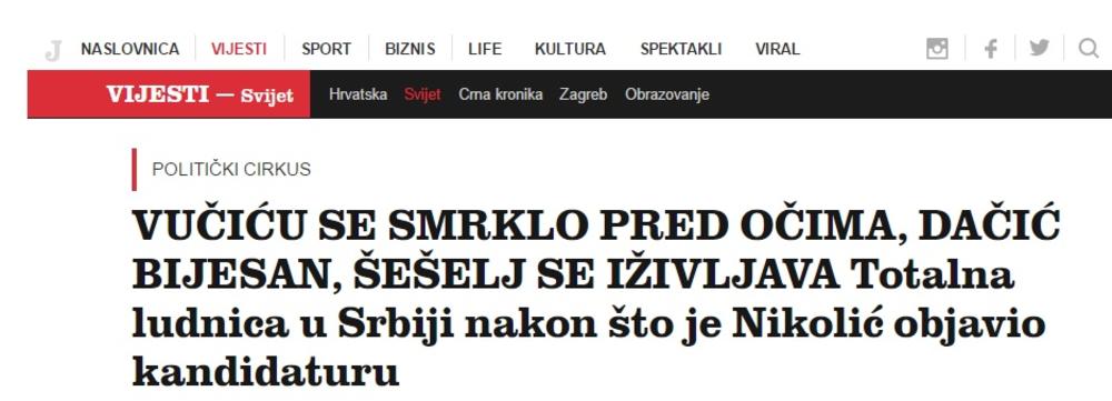- Vučiću se smrklo pred očima, Dačić besan, Šešelj se iživljava - totalna ludnica u Srbiji nakon što je Nikolia objavio kandidaturu - piše list u novom tekstu objavljenom on-lajn, dodajući da izbori za novog predsednika Srbije definitivno neće biti dosadni.