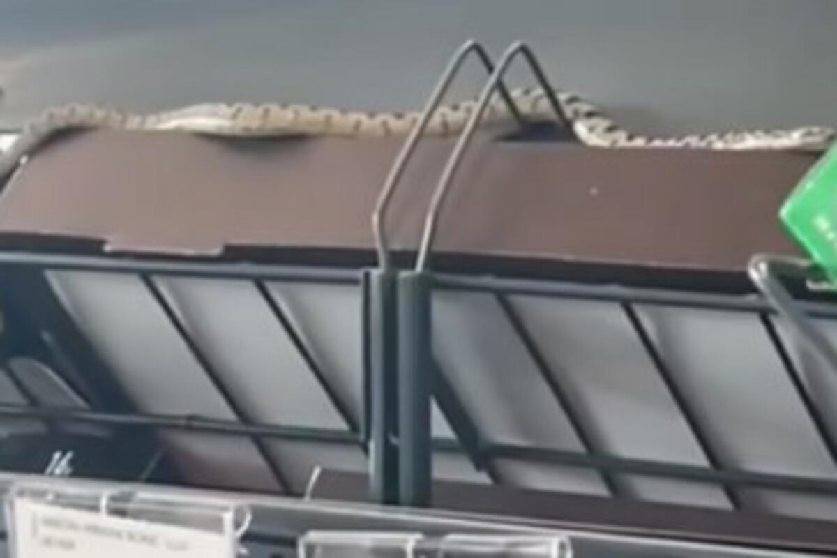 Zmija na snimku nije posebno velika, no zasigurno je neugodno iznenadila kupce i radnike.