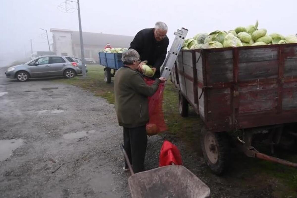 Božidar Mušić, koji uzgaja kupus već 40 godina, došao je danas sa dve pune prikolice ispred zgrade Opštine Berek i besplatno podelio ljudima deset tona kupusa.