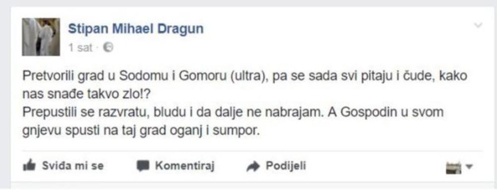 - Pretvorili grad u Sodomu i Gomoru (Ultra), pa se sada svi pitaju i čude, kako nas snađe takvo zlo?! Prepustili se razvratu, bludu i da dalje ne nabrajam. A Gospodin u svom gnjevu spusti na taj grad oganj i sumpor - napisao je te zaprepastio čak i neke vernike.