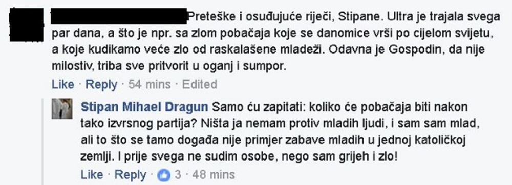 "Sram te bilo", "ipak ne verujem da je dragi Bog osvetoljubiv", samo su neki od komentara. "Stipane brate mani se ovakvih izjava! Bolje da si pomogao, a ne sudio iz fotelje...", poručio mu je jedan korisnik Fejsbuka. "Dragi brate upravo pomažem, a ponajprije molitvom, kome se ne sviđa, može misliti drugačije.