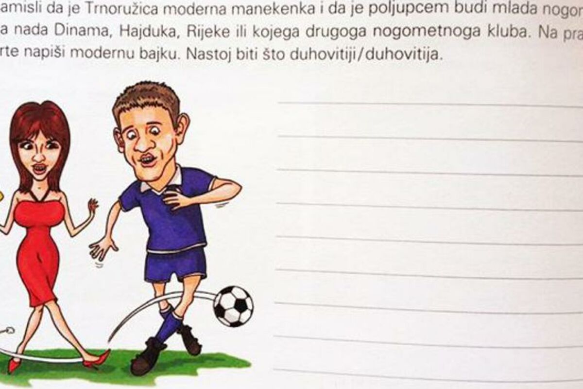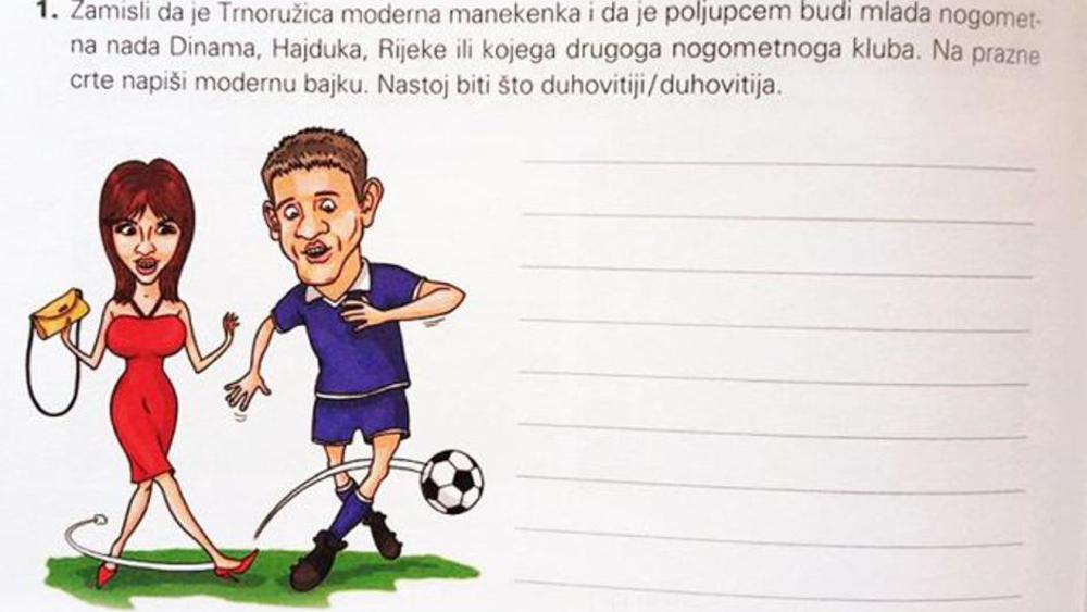 Zamisli da je Uspavana lepotica moderna manekenka i da je poljupcem budi mlada fudbalska nada Dinama, Hajduka, Rijeke ili nekog drugog fudbalskog kluba. Na prazne crte napiši modernu bajku. Nastoj biti što duhovitiji/duhovitija, glasi zadatak u radnoj beležnici 'Jezik moj hrvatski', namenjen učenicima petog razreda osnovnih škola. Uz zadatak su ilustrovani fudbaler i žena bujnih grudi. Fotografija tog zadatka proširila se ovih dana društvenim mrežama i izazvala negodovanje roditelja u žustrim raspravama, iako je reč o udžbeniku koji se ne koristi već deset godina.