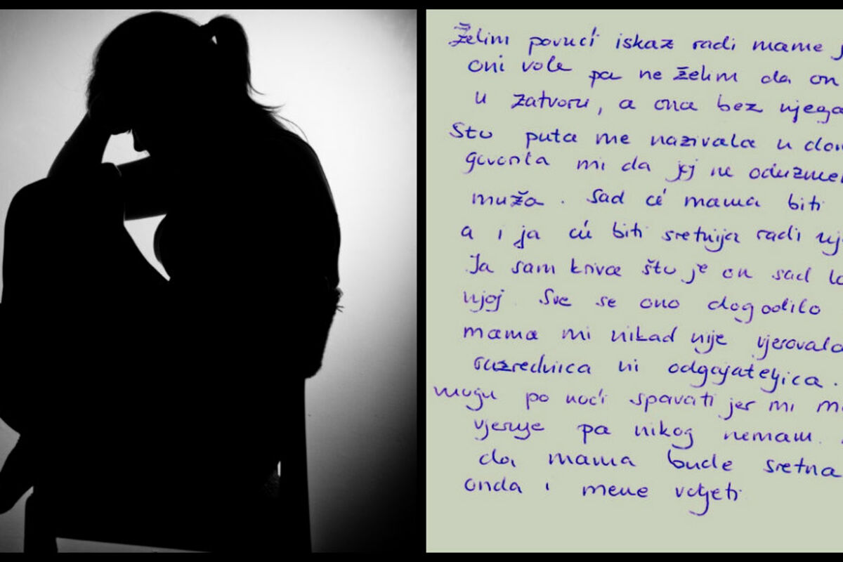"Želim povući iskaz radi mame jer se oni vole pa ne želim da on bude u zatvoru, a ona bez njega. Sto puta me nazvala u dom i govorila mi da joj oduzimam muža. Sad će mama biti srećna, a i ja ću biti srećnija radi nje. Ja sam kriva što je on sad loš prema njoj. Sve se ono dogodilo, ali mama mi nikad nije verovala ni razredna ni dadilja. Često ne mogu po noći spavati jer mi mama ne veruje pa nikog nemam. Želim da mama bude srećna pa će onda i mene voleti", u potresnom je pismu napisala devojčica koja je povukla iskaz kako bi zbog majčinog pritiska spasila očuha koji ju je seksualno zlostavljao.