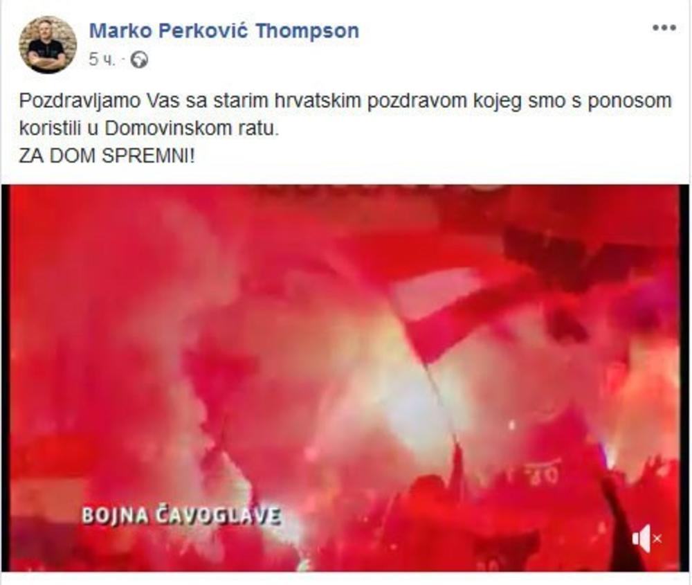 Hrvatski pevač Marko Perković Tompson objavio je na Fejsbuku snimak sa koncerta na kojem izvodi pesmu „Bojna Čavoglave“, u kojoj se glorifikuje ustaštvo i pozdravio fanove ustaškim pokličom „za dom spremni“.