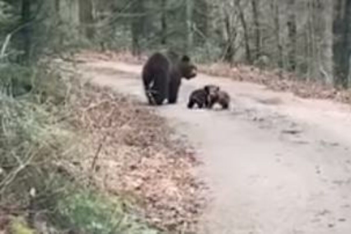 Neobičan prizor mame medvedice i dva medvedića kako mirno šetaju putem u predelu Rušice, na području šumskog dobra Novi Vinodolski snimio je inženjer šumarstva Zoran Turk, koji je bio u redovnom obilasku terena.
