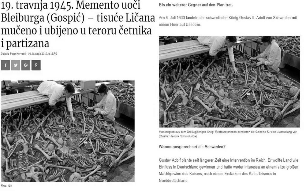 Ništa od toga ne bi bilo spomena vredno, da urednici tekst nisu ilustrovali fotografijom na kojoj dve ženske osobe prebiraju po ljudskim kosturima čime se čitaocima sugeriše da se radi o iskopanim kostima stradalih u partizanskom pokolju. Kao izvor fotografije naveden je FaH, što je bila skraćenica za Fotografsku agenciju Hrvatske informativne agencije (Hina).