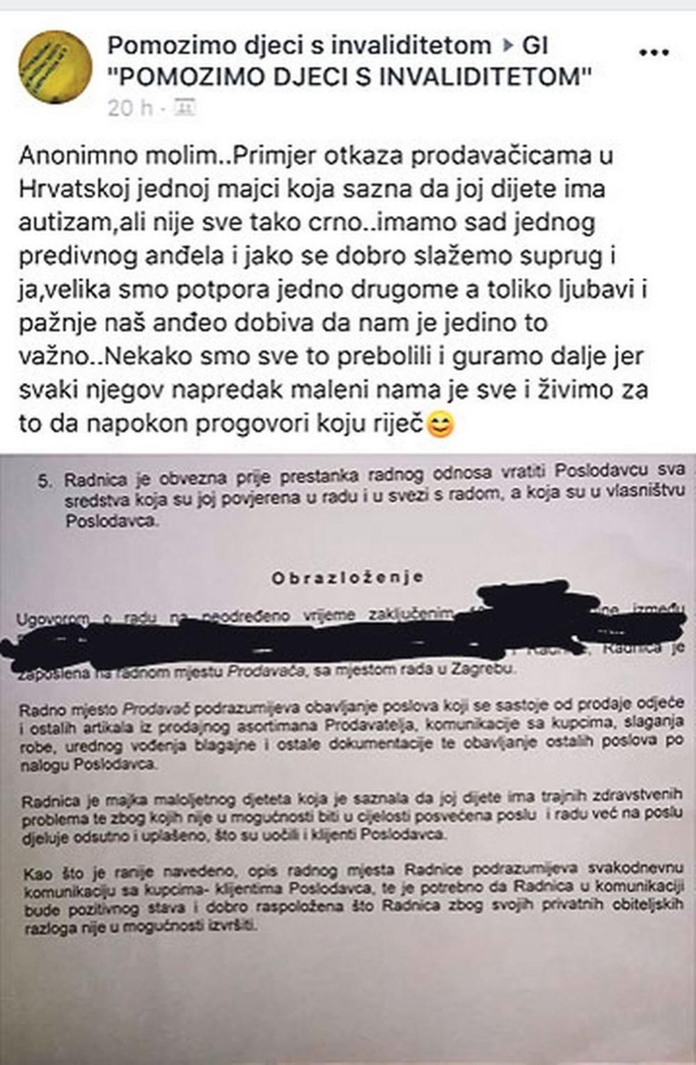 Kao što je ranije navedeno, opis radnog mesta Radnice podrazumeva svakodnevnu komunikaciju s kupcima - klijentima Poslodavca te je potrebno da Radnica u komunikaciji bude pozitivnog stava i dobro raspoložena, što radnica zbog svojih privatnih porodičnih razloga nije u mogućnosti izvršiti - stoji u obrazloženju otkaza prodavačici iz Zagreba, čija je preslika objavljena na Facebook grupi Građanska inicijativa “Pomozimo deci s invaliditetom”.