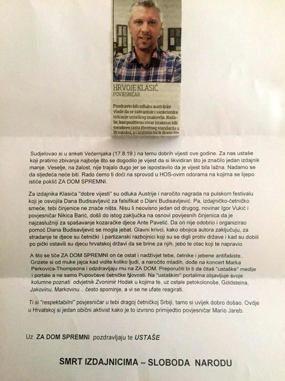 Istoričara Hrvoja Klasića danas je u njegovoj kancelariji na Filozofskom fakultetu dočekalo pismo s ozbiljnim pretnjama. Autori pisma navode da su se radovali vesti da je Klasić likvidiran, ali 'veselje, nažalost, nije dugo trajalo jer se ispostavilo da je vest bila lažna'.