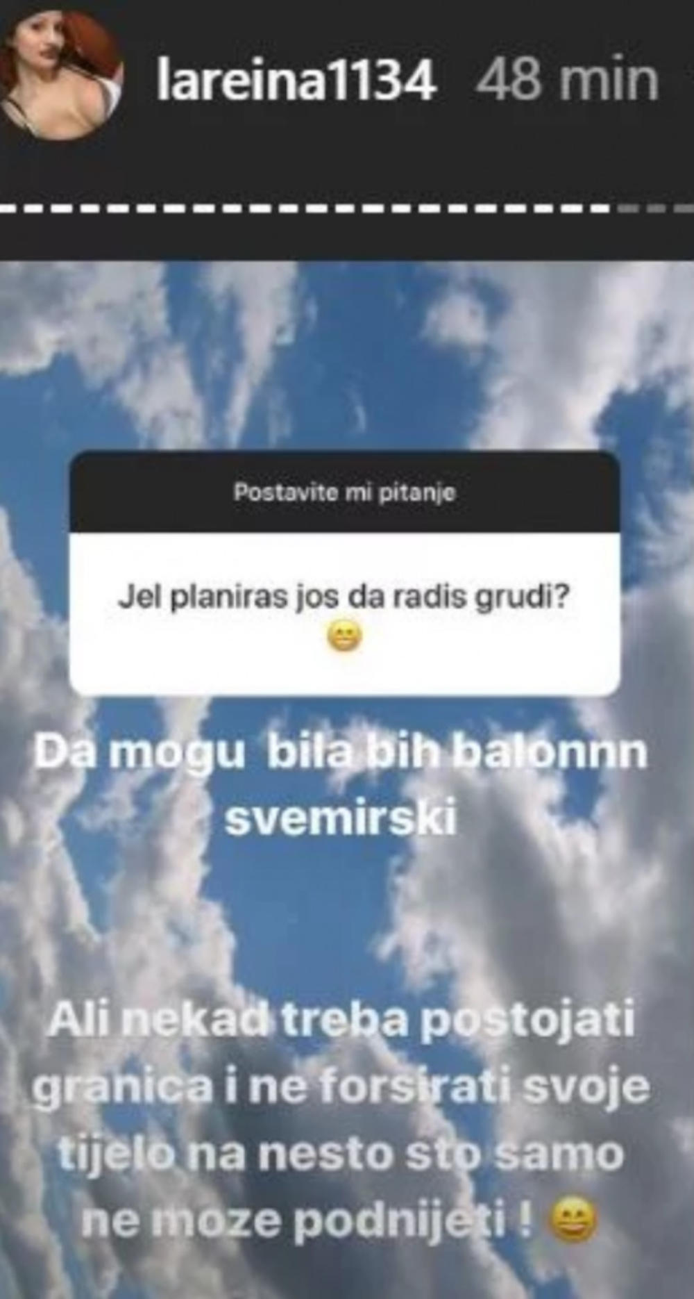 Kristina Mandarina na Instagram storiju odgovarala je na pitanja svojih vernih pratilaca, a jedno od njih bilo je i hoće li ponovo povećati grudi.