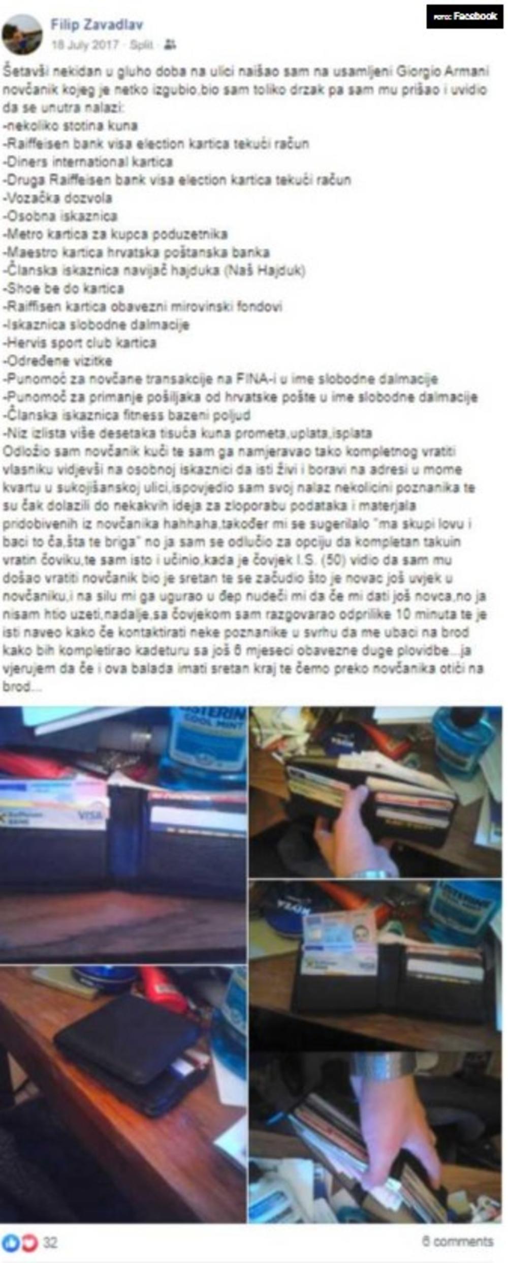 Zavadlav je u statusu na Facebooku iz jula 2017. godine detaljno opisao kako je pronašao nečiji novčanik, vratio ga, a zauzvrat mu je vlasnik kazao kako će ga ubaciti na brod.