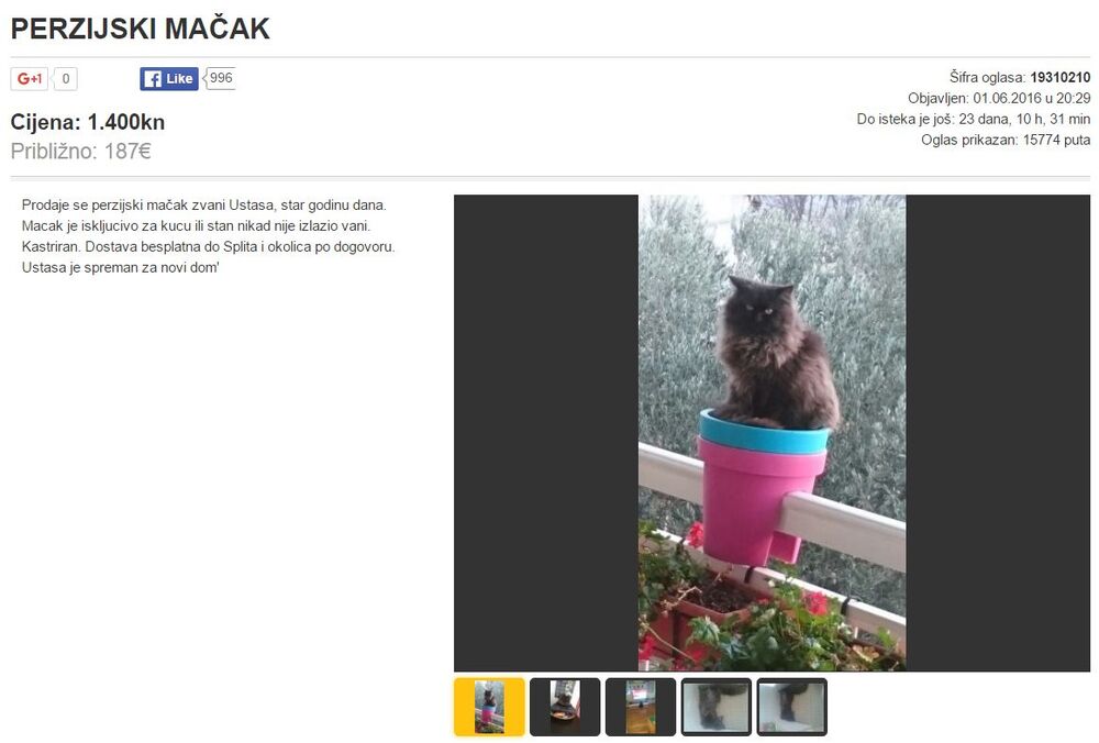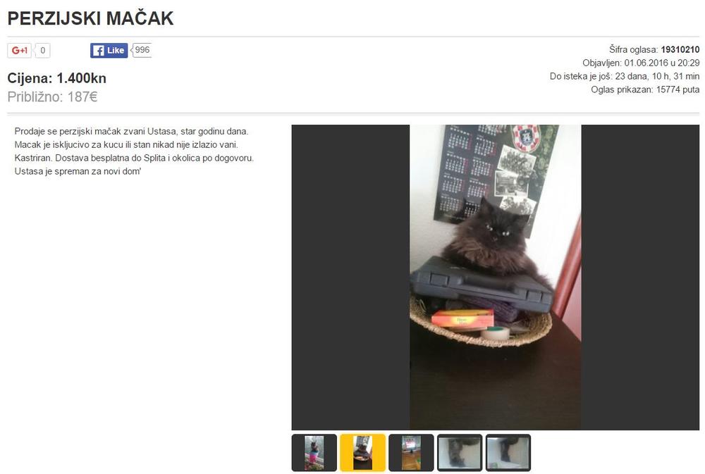 Nema ništa čudno u tome što vlasnik persijske mačke hoće da proda svog ljubimca, ali je malo neuobičajno kada se taj ljubimac zove - Ustaša!