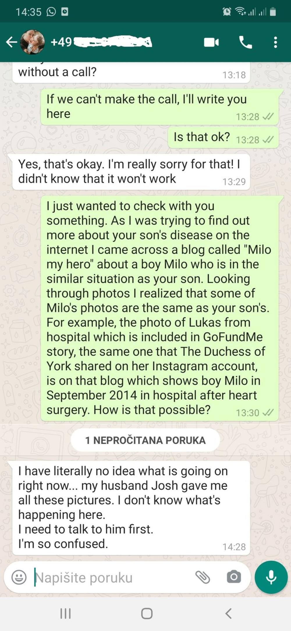 - Samo sam htela s vama nešto proveriti. Dok sam na internetu pokušavala saznati više o bolesti vašeg sina, naišla sam na blog pod nazivom 'Milo moj heroj' o dečaku imena Milo. Pregledavajući fotografije shvatila sam da su neke od Milinih fotografija jednake fotografijama vašeg sina. Na primer, fotografija Lukasa iz bolnice koja je uključena u GoFundMe priču, ista ona koju je vojvotkinja od Jorka podelila na svom Instagram profilu, nalazi se na tom blogu koji prikazuje dečaka Mila u septembru 2014. godine u bolnici nakon operacije srca. Kako je to moguće? - pitam je.