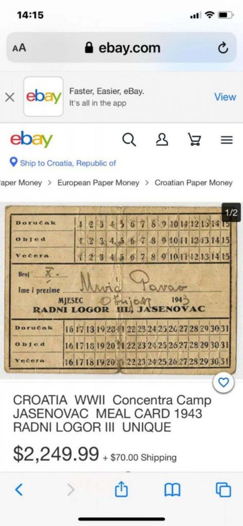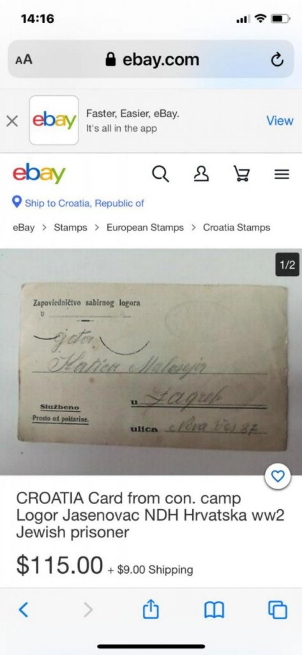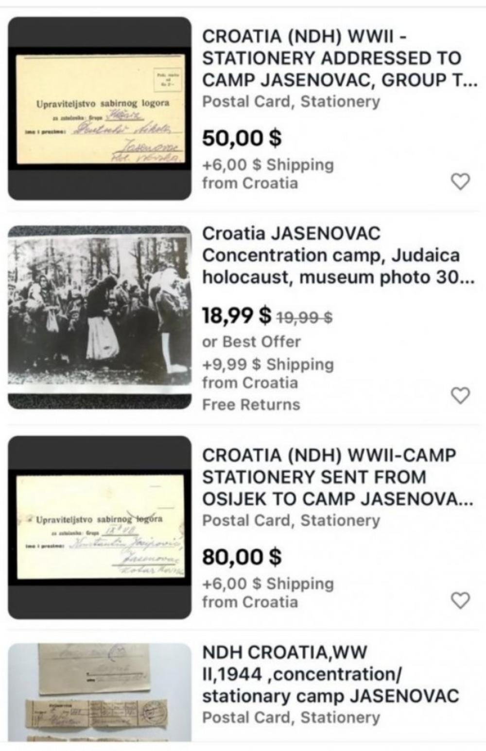 Mnogobrojni predmeti, dokumenti i pisma iz vremena zločinačke ustaške države NDH, ali i onih koji podsećaju na patnje logoraša iz zloglasnog Jasenovca, slobodno se prodaju na Ibeju za cenu od 10 do 2.249,99 dolara.