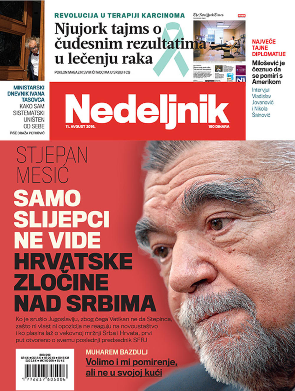 Ratne sjekire bit će zakopane onoga trenutka kada se svi, i mi u Hrvatskoj i vi u Srbiji, suočimo s istinom o prošlosti, u prvome redu svojoj, ali ne i samo svojoj. To je osnovni preduvjet da se prestanu širiti predrasude prema "onim drugima", da se prestane širiti legenda o stoljetnom neprijateljstvu, što je notorna laž, da se prekine s netolerancijom na nacionalnoj i vjerskoj osnovi. Ja sam pokušao utrti put prema takvome razvoju. Počeo jesam, ali oni iza mene nisu nastavili, konstatovao je Stjepan Mesić, bivši predsednik Hrvatske, i čovek koga i danas smatraju poslednjim političkim simbolom SFR Jugoslavije, u intervjuu za Nedeljnik u kojem je otvoreno pričao o poslednjim prepucavanjima Beograda i Zagreba, ustaštvu u Hrvatskoj, slučajevima Barešić, Stepinac i Glavaš, te o svom povratku u politiku.