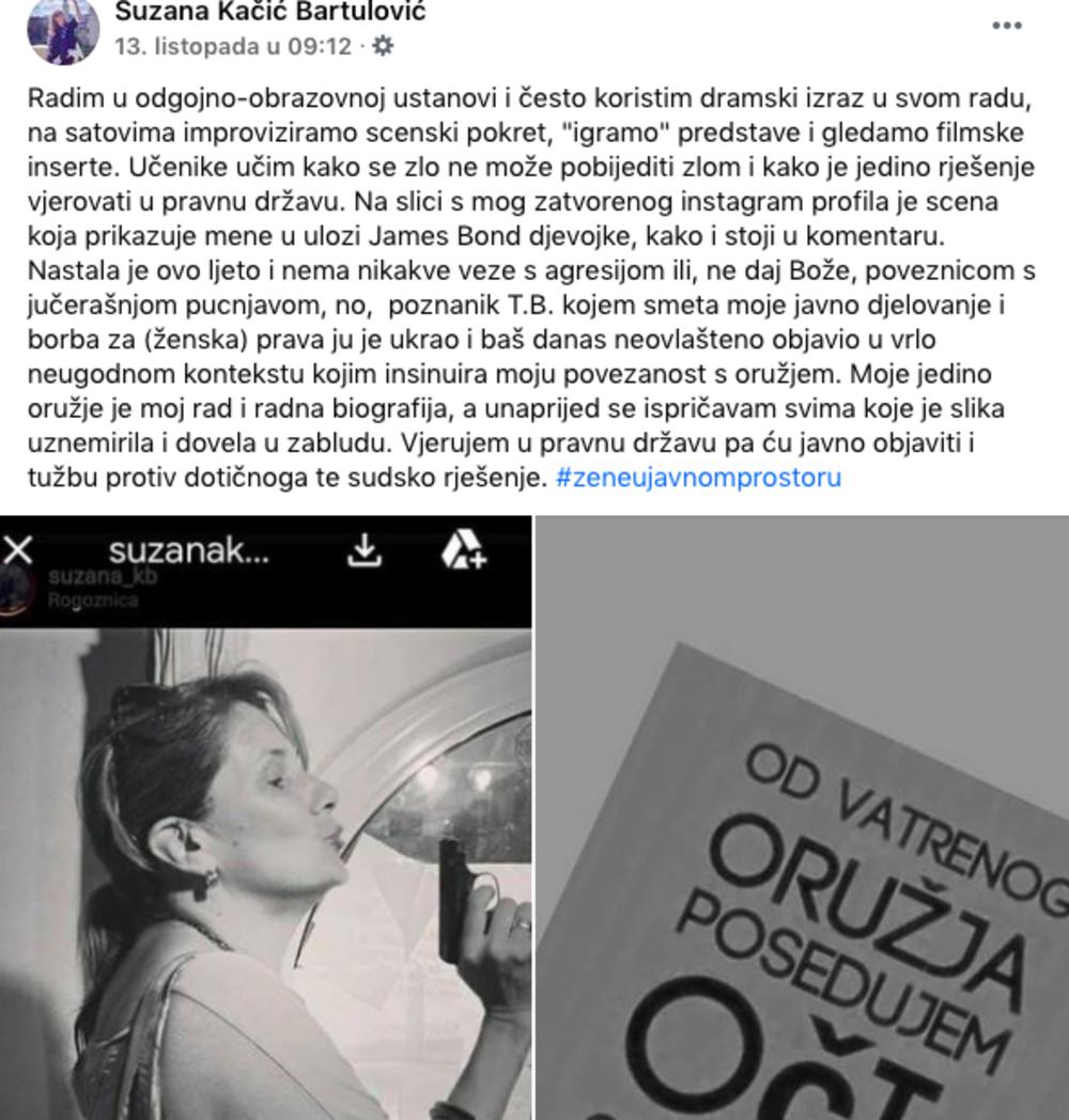 Proteklih dana društvenim mrežama počele su da kruže fotografije Suzane Kačić Bartulović, profesorke hrvatskog jezika na Ekonomskom i kancelarijskom fakultetu u Splitu, koja ponosno pozira s pištoljem u rukama.