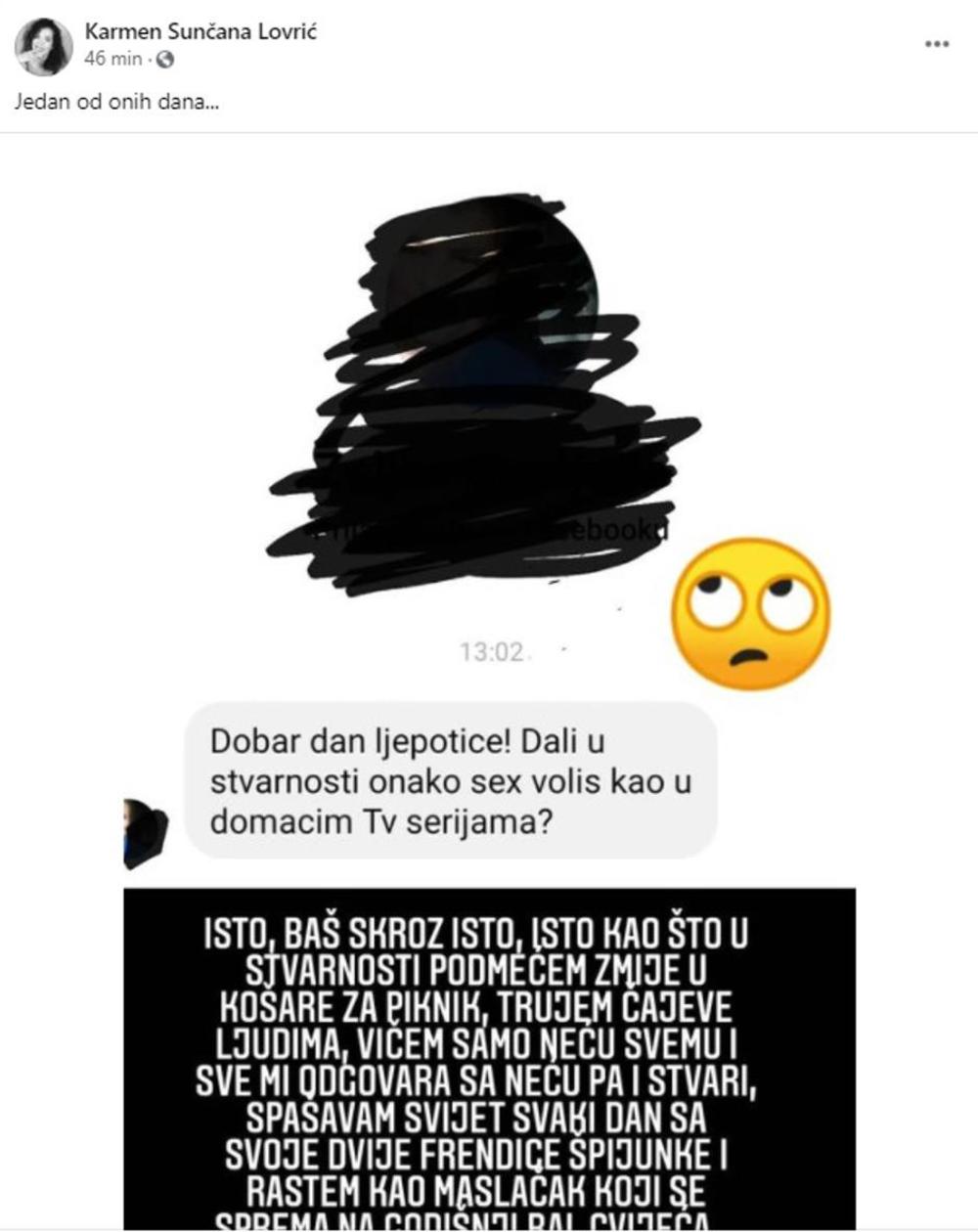 Karmen Sunčana Lovrić, glumica najpoznatija po ulogama u serijama Nove TV "Na granici" i "Kud puklo da puklo", na Facebooku je objavila "ulet" nepoznatog "junaka", koji joj je poslao nepismenu poruku: