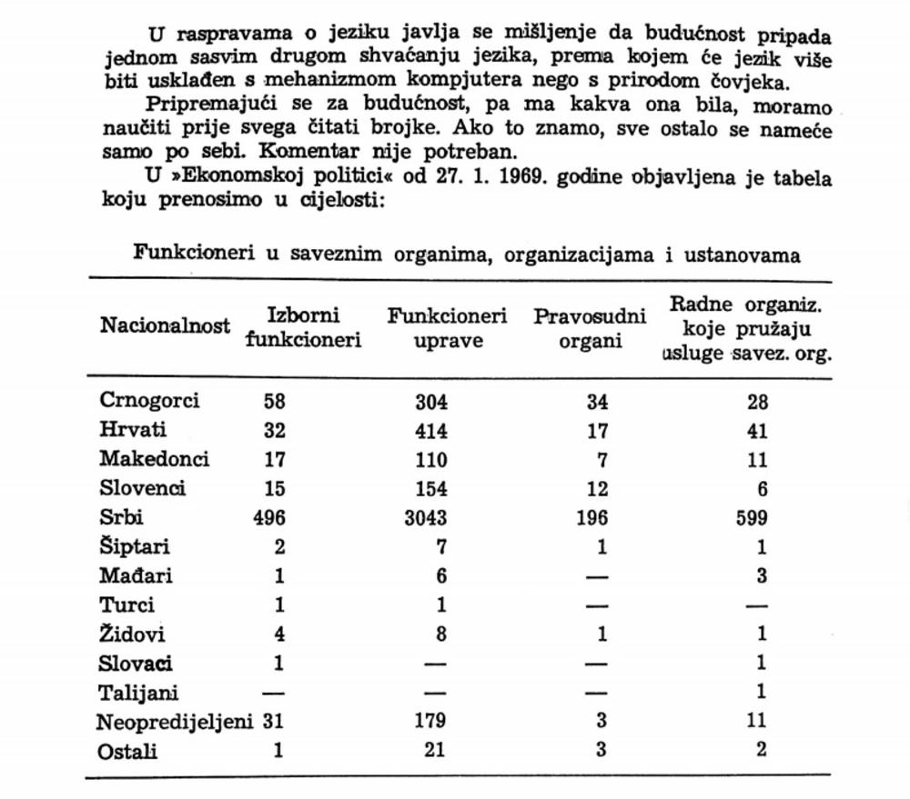 U tabeli pod imenom "Funkcioneri u saveznima organima, organizacijama i ustanovama" naveden je nacionalni sastav vlasti u SFRJ iz kojeg bi trebalo da se vidi kako su Srbi bili favorizovani.