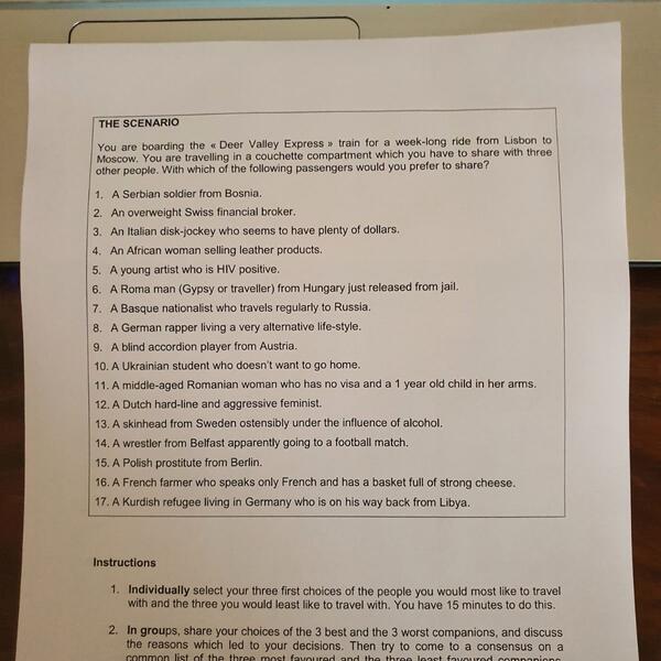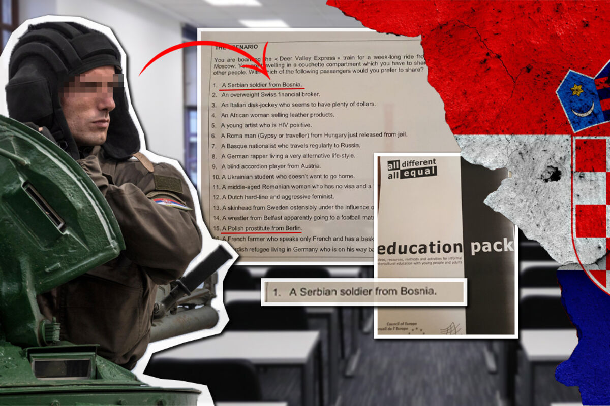 U Hrvatskoj je danas jedna od glavnih vesti skandal koji je izbio u jednoj osnovnoj školi u Kastavu kada je nastavnica veronauke učenicima osmog razreda dala zadatak u kom je tražila od učenika da kažu zašto (ne) žele da u vozu sede pored starijeg monaha s Biblijom u rukama, homoseksualca, srpskog vojnika iz Bosne ili prostitutke iz Berlina.