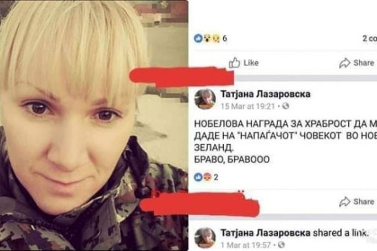 „Nobelova nagrada za hrabrost da se da „napadaču“, čoveku u Novom Zelandu. Bravo, bravooo“, napisala je pripadnica artiljerijske jedinice Armije Republike Severne Makedonije, Tatjana Lazarovska na svom FB profilu i podigla uzbunu u ovdašnjoj javnosti, uz oštre osude medija i konačno Generalštaba vojske u Skoplju.