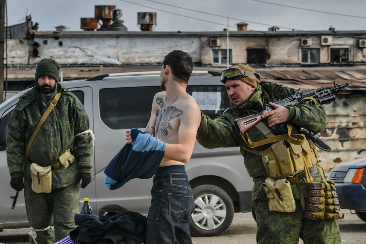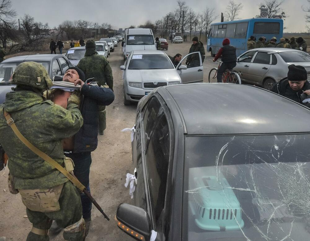 Pripadnici milicije Donjecke Narodne Republike (DNR) kontrolišu stanovnike koji napuštaju opkoljeni južni lučki grad Mariupolj u Donjeckoj Narodnoj Republici.