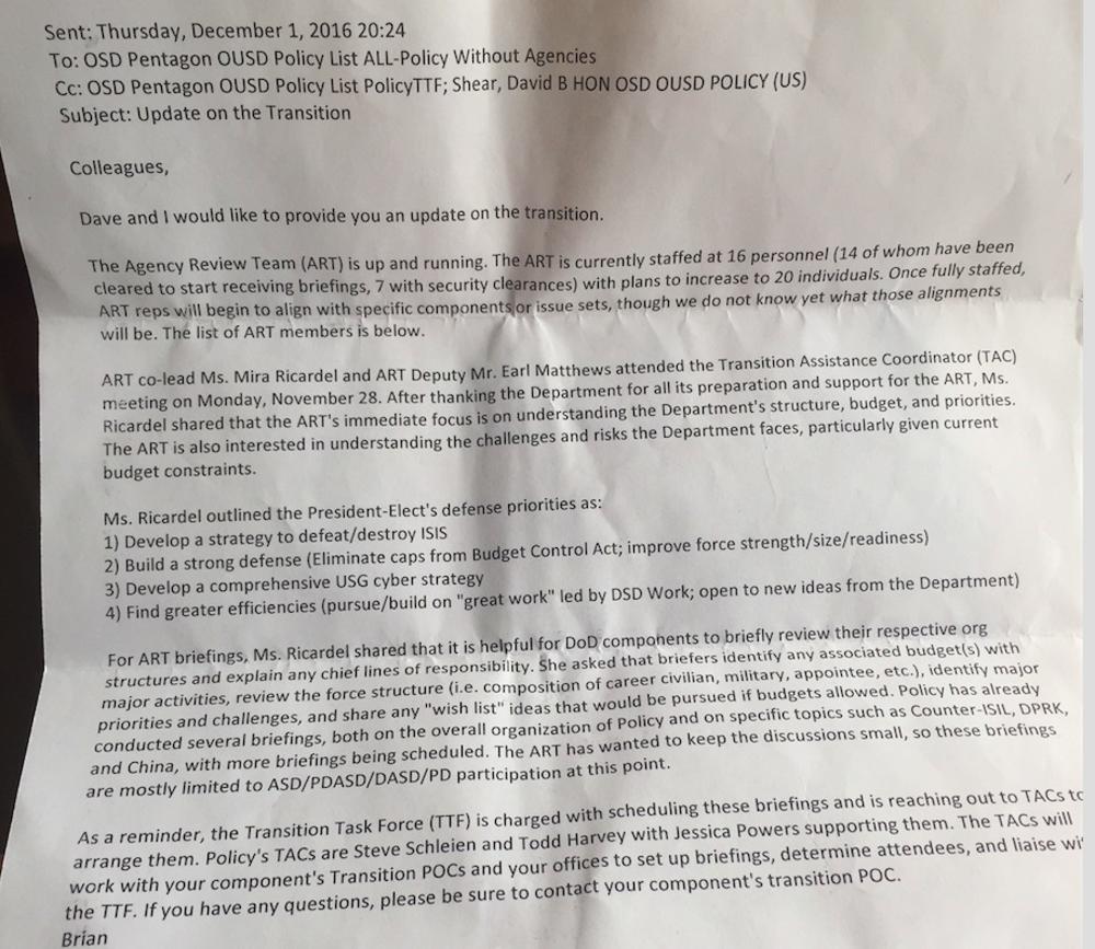 Novoizabrani predsednik SAD Donald Tramp fokusiraće se tokom mandata na borbu protiv Islamske države i smanjenje nepotrebnih troškova koji opterećuju američki budžet, navodi se u procurelom dokumentu komunikacije između Trampa i Pentagona.