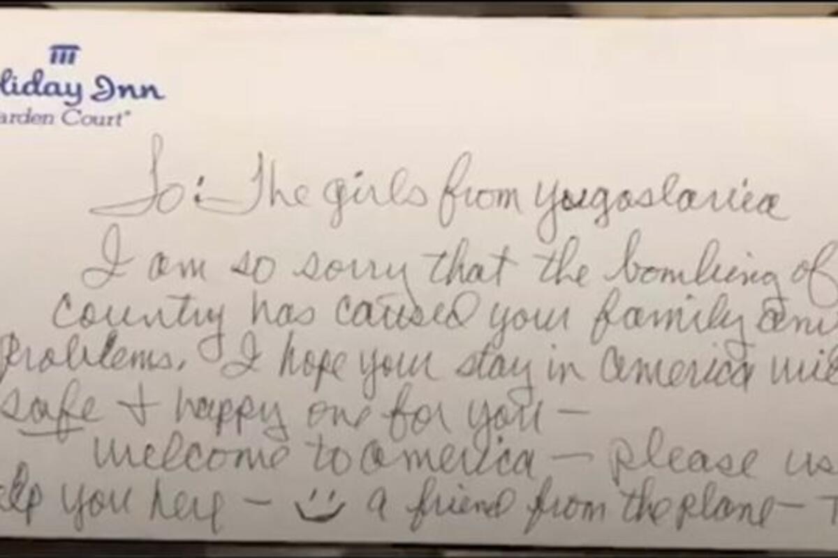Starija Amerikanka je Jugoslavenkama dala kovertu u kojoj se nalazila poruka: "Za devojke iz Jugoslavije, žao mi je što je bombardovanje vaše zemlje uzrokovalo vašoj porodici toliko problema. Nadam se da će vaš boravak u Americi biti siguran i sretan za vas. Dobro došle u Ameriku. Molim vas, neka vam ovo pomogne. Vaša prijateljica iz aviona, Trejsi."