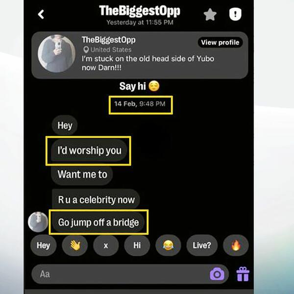 Slao je i agresivne poruke preko aplikacije. Rekao je jednoj devojci na Dan zaljubljenih da će je obožavati pre nego što joj kaže da treba da skoči sa mosta. Ovo ponašanje je ponovio i kada je bio u onlajn audio sobi za ćaskanje na Iubu. Tom prilikom je u grupi rekao: „Pretpostavljam da svi zaslužuju da budu silovani.“