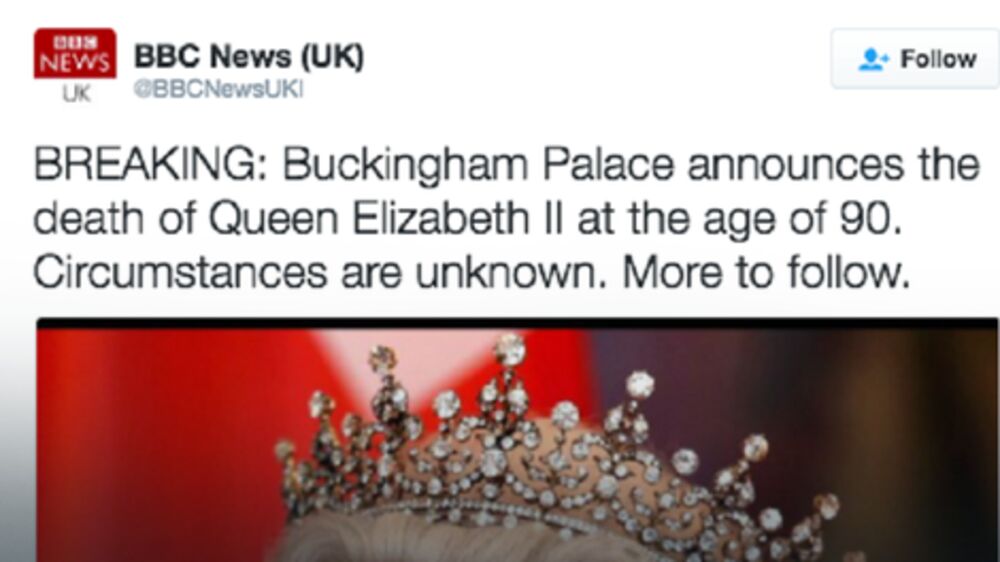 Prava histerija nastala je na društvenoj mreži Tviter nakon što je sa lažnog profila BBC-ja objavljeno da je kraljica Elizabeta II preminula.