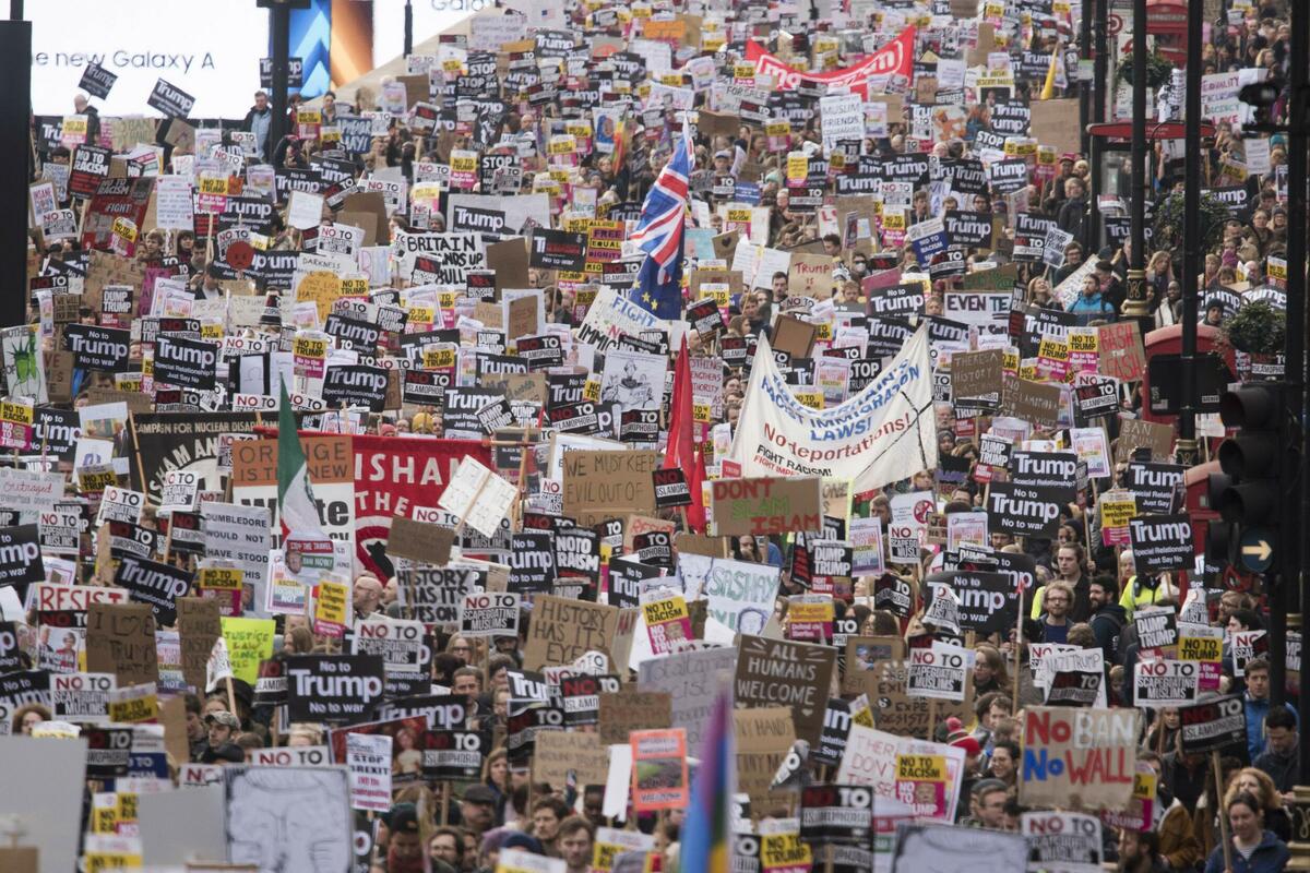 Demonstranti su došli u britansku prestonicu iz raznih delova zemlje. Okupljeni su zviždali, klicali i aplaudirali dok je plava baklja upaljena kako bi označila početak marša. Pojedini učesnici su uzvikivali: "Izbeglice su ovde dobrodošle". Glasna muzika, uključujući pesme "I Need A Dollar" i "Money, Money, Money" čule su se sa velikih zvučnika, a okupljeni su pevali i plesali.