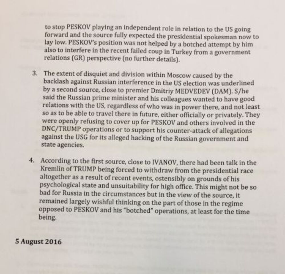 3. Razmere nezadovoljstva u Moskvi zbog negativnih reakcija na rusko mešanje u američke izbore naglasio je drugi izvor, blizak premijeru Medvedevu. On je rekao da je ruski premijer, sa svojim kolegama, želeo da ima dobre odnose sa SAD, bez obzora na to ko je tamo na vlasti, i barem da bude u mogućnosti da putuje tamo, zvanično ili privatno. Oni su otvoreno odbijali da prikriju peskova i druge uključene u DNC/Tramp operaciju, ili da podrže njegove kontranapade, to jest optužbe da je američka vlada hakovala rusku vladu i njene državne agencije.