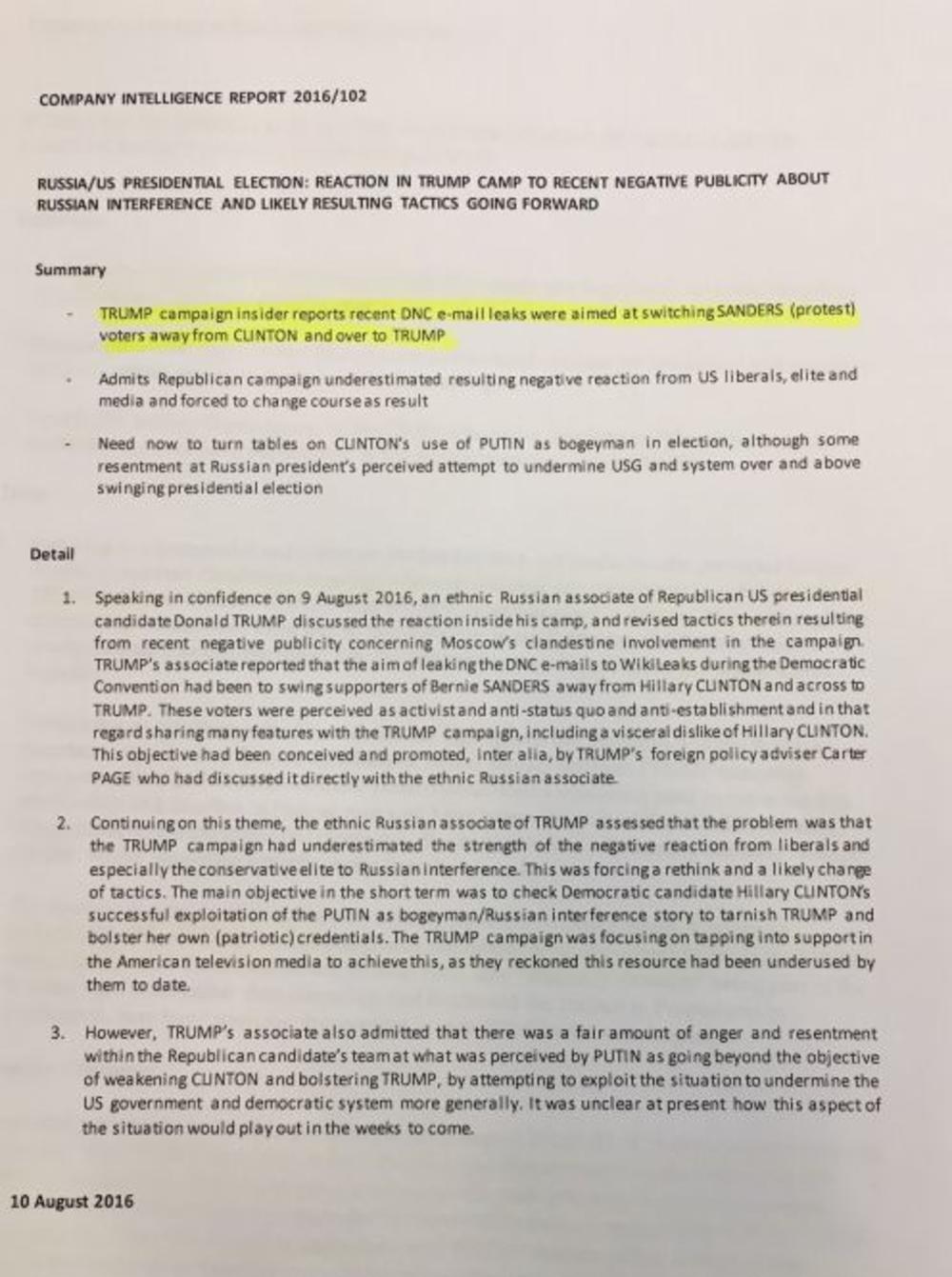 1. Govoreći u poverenju 9. avgusta 2016, Rus koji je saradnik republikanskog predsedničkog kandidata Donalda Trampa diskutuje o reakciji u njegovom kampu, i o promeni taktike koja je rezultat negativnog publiciteta koji okružuje mešanje Moskve u kampanju. Trampov saradnik izveštava da je curenje DNC mejlova u WikiLeaks za vreme demokratske konvencije bilo namenjeno prebacivanju glasača Bernija Sandersa na stranu Trampa, a od Hilari Klinton. Ovi glasači su procenjeni kao aktivisti i anti-status kvo i anti-establišment glasači, i kao ljudi koji dele mnoge stavove sa Trampovom kampanjom, uključujući i iskrenu mržnju prema Hilari Klinton. Ovaj cilj je bio zamišljen i promovisan, između ostalih, i od strane Kartera Pejdža, savetnika za spoljnu politiku koji je o tome diskutovao direktno sa ovim Rusom.