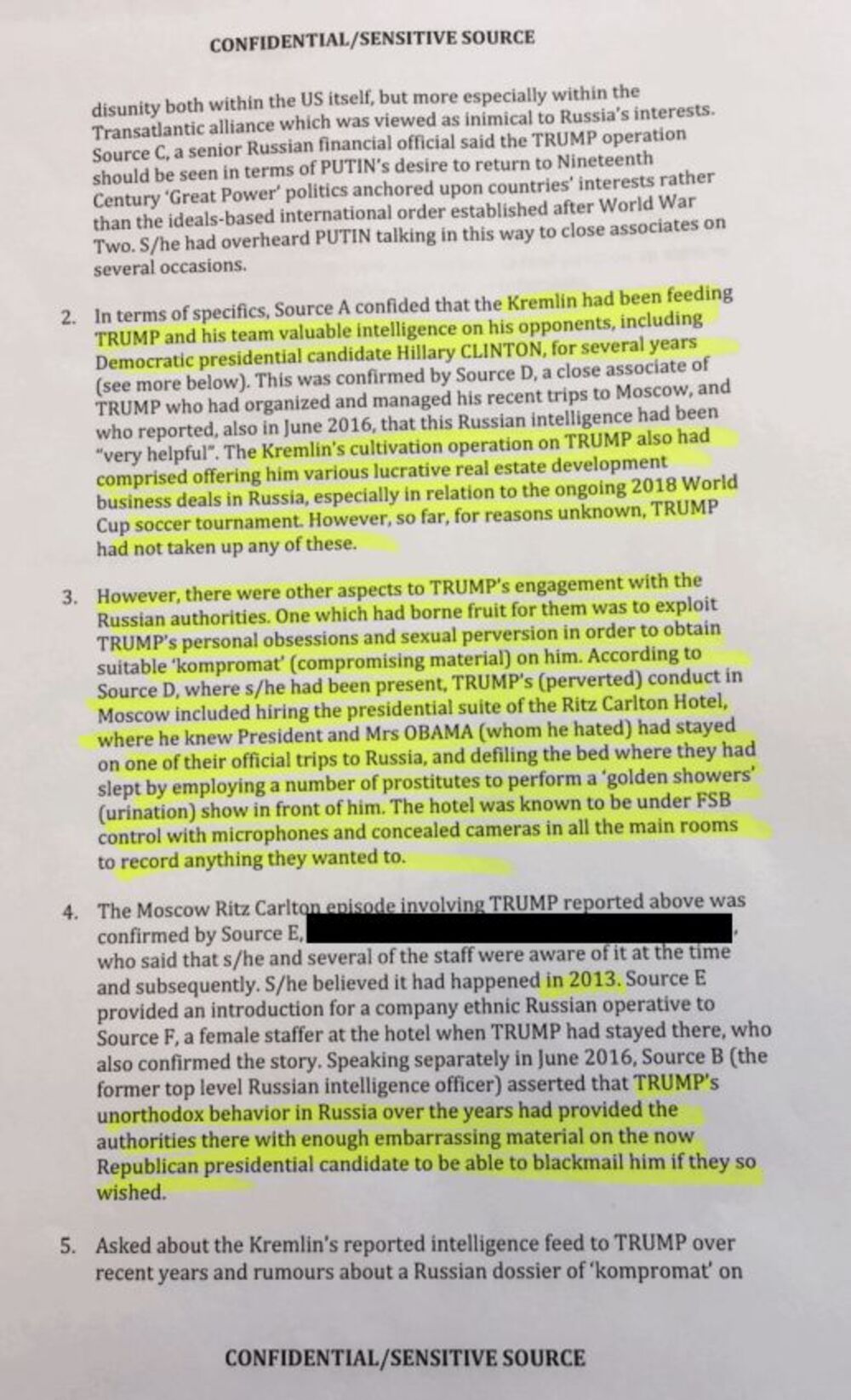 3. Ipak, postojali su drugi aspekti Trampove interakcije sa ruskim vlastima. Jedna od njih je urodila mogućnošću da se eksploatišu Trampove lične opsesije i seksualne perverzije, kako bi se obezbedio odgovarajući "kompromat" (kompromitujući materijal) o njemu. Prema Izvoru D, koji je bio na licu mesta, među Trampovim perverzijama u Moskvi je bio i slučaj kada je iznajmio predsednički apartman u hotelu Ric Karlton, za koji je znao da su u njemu odseli predsednik Obama i gospođa Obama, na jednom od njihovih putovanja u Rusiju. Tramp je platio prostitutkama da "unerede" krevet urinirajući po njemu, dok ih je on gledao. Za ovaj hotel se zna da je pod kontrolom FSB, sa mikrofonima i skrivenim kamerama u svim glavnim sobama, koje snimaju sve što oni žele.