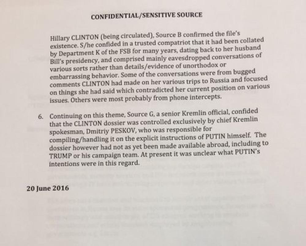 6. Nastavljajući priču o ovoj temi, Izvor G, visoki zvaničnik Kremlja, poverio je da je dosije Hilari Klinton kontrolisao isključivo glavni portparol Kremlja Dmitrij Peskov, koji je bio odgovoran za skupljanje i rukovanje ovim informacija po izričitim instrukcijama samog Putina. Ovaj dosije, međutim, još uvek nije dostupan nikome izvan Rusije, uključujući i Trampa i njegov tim za kampanju. Još uvek nije poznato kakve su Putinove namere u vezi sa ovim.