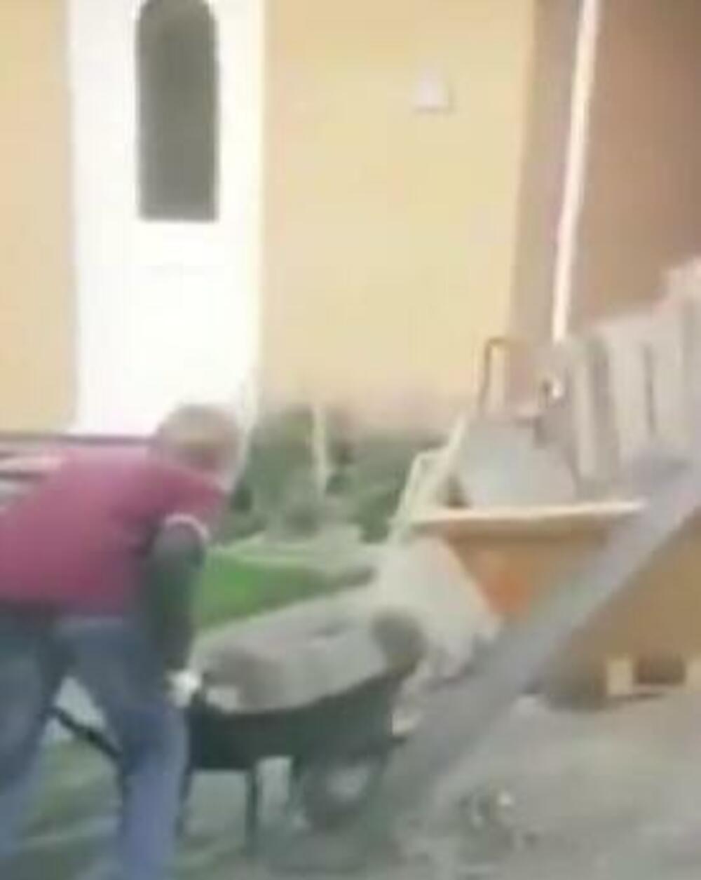 Na video snimku možemo videti muškarca koji je pokušao da prebaci kamene blokove uz pomoć kolica, ali na njegovu muku, to nikako nije uspevao da učini