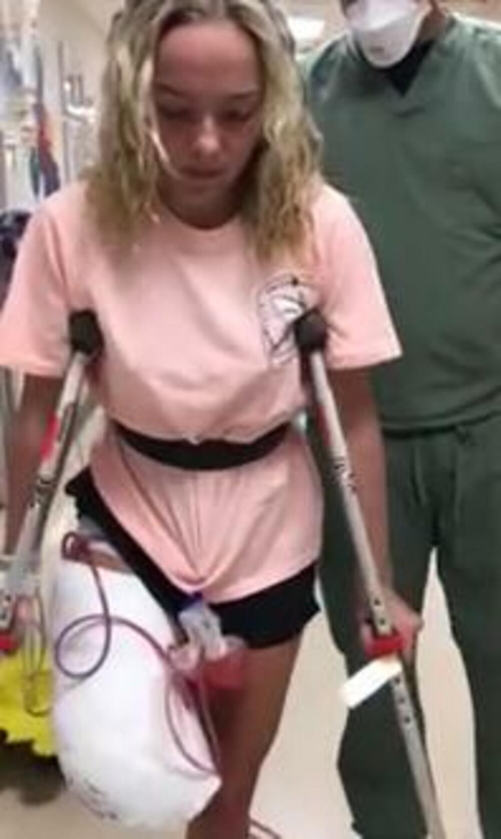Tinejdžerka Adison Betia koja je na sreću preživela napad ajkule na plaži u Floridi, amputirana je noga, pa sada u bolnici uči da hoda na štakama.