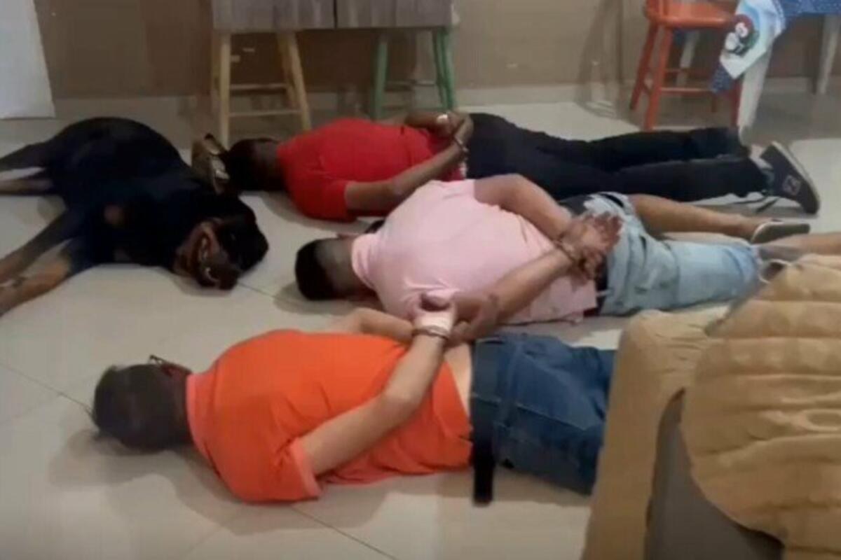Uhapšeni se vide se kako leže licem prema dole na podu s rukama vezanim lisicama na leđima. No i masivni rotvajler ove bande takođe je odlučio da se preda i baci pokraj trojice osumnjičenih.