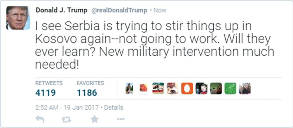 Nekoliko dana deli novog američkog predsednika Donalda Trampa od preuzimanja funkcije, a danas se "brzinom munje" preneo navodno njegov novi tvit u kome je najavio novo bombardovanje Srbije?!