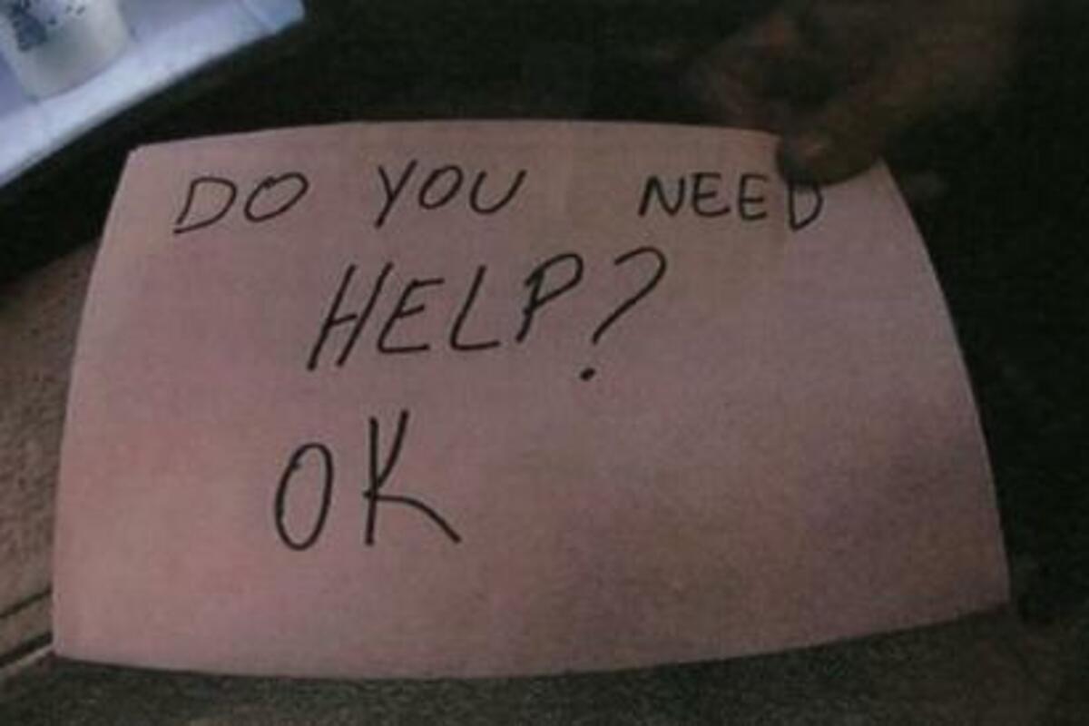 Karvaljo je napisala poruku sa pitanjem "Da li ti je potrebna pomoć? Ok" i pokazala je dečaku iza leđa njegovih roditelja.