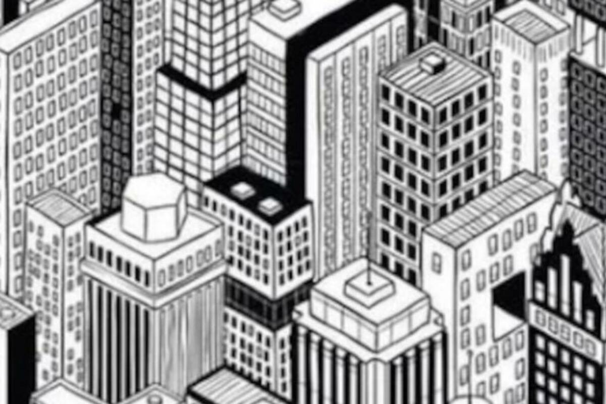 Ilustracija prikazuje nizove crno-belih nebodera različitih oblika i veličina. Neboderi imaju zamršene uzorke, zbog čega je iluziju teže rešiti.