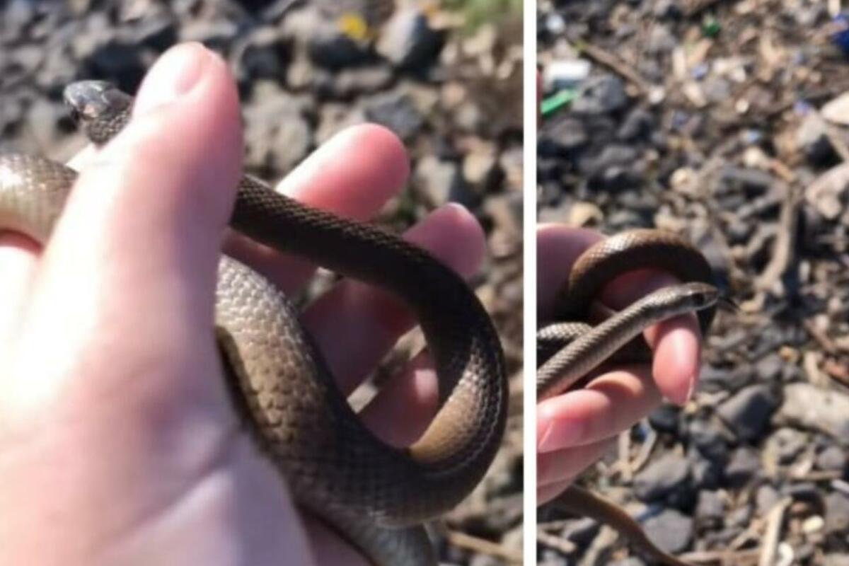 Na snimku se vidi mala smeđa zmija omotana oko njene ruke dok devojčica priča: „Upravo sam našla zmiju“.