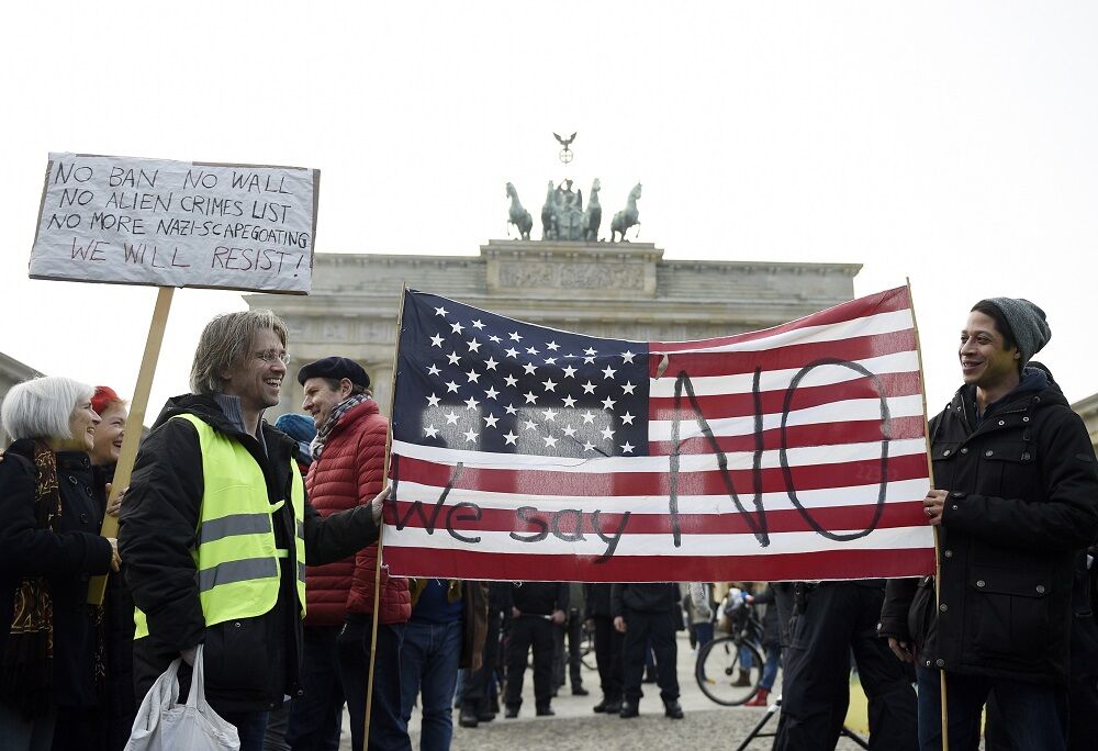Na skupu protiv Trampa u Berlinu okupilo se oko 1.200 ljudi, koji su nosili transparente s natpisima "Borite se protiv neznanja a ne protiv izbeglica".