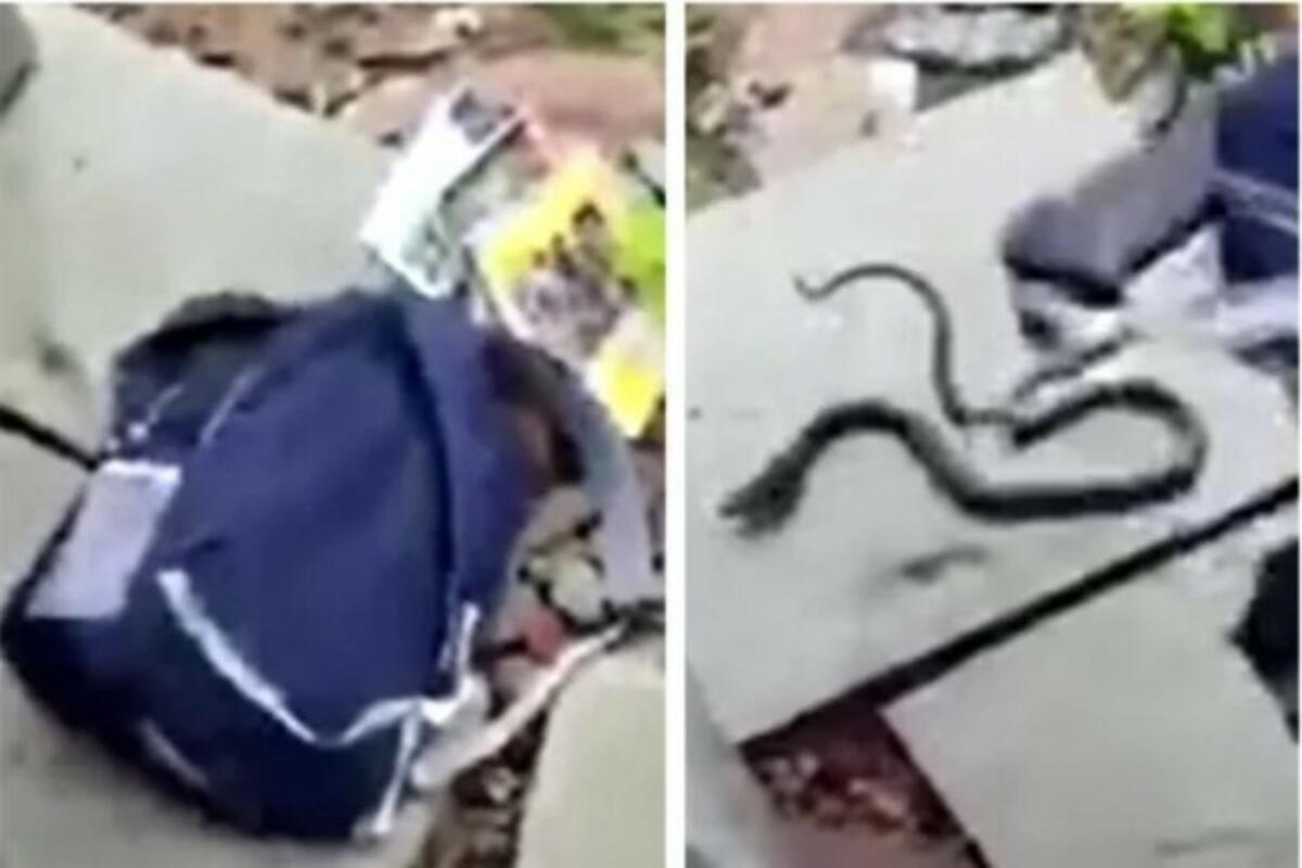 Na snimku koji je nastao u sredu u gradu Badona se vidi kako on otkopčava torbu i istresa opasnu otrovnicu zajedno sa školskim priborom.