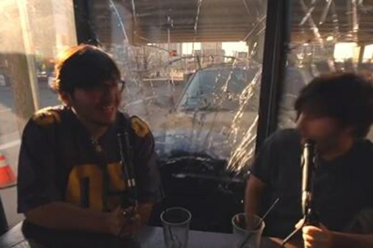 Samo nekoliko sekundi nakon što jedan od dvojice mladića iz videa rekao da je u kafiću tako tiho, crni automobil je udario u kafić, potpuno razbijajući prozor. Na sreću, iako je ovo mogao biti koban trenutak, podkasteri su prošli sa lakšim povredama.