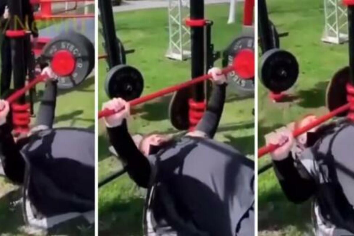 Na klupi u javnom parku, podiže naizgled teške tegove i duboko uzdiše dok ga dvoje ljudi snima