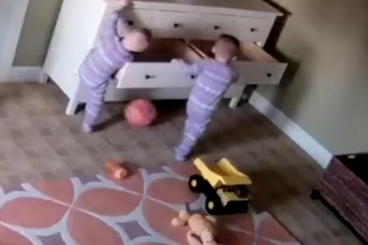 Na snimku se vidi kako se braća igradu na komodi kada se ona prevrće, pritiskajući jednog od njih ispod boka. Boldi