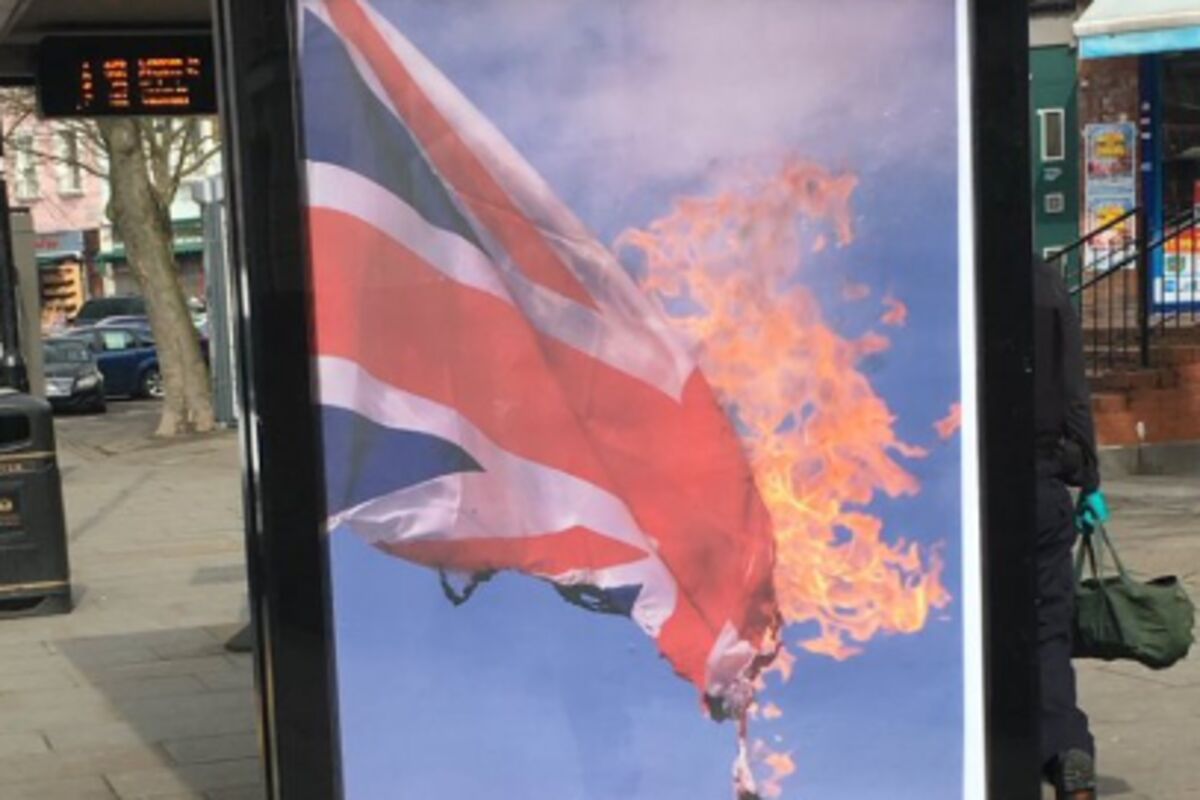 Poster koji pokazuje zapaljenu britanski zastavu misteriozno se pojavio na autobuskoj stanici u Londonu